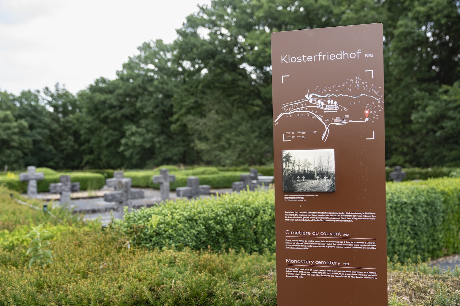 En 1933, les Prêtres du Sacré-Cœur amènagent leur propre cimetière à l’écart de l’enceinte du couvent. La première inhumation y a lieu en 1934. Les prêtres et novices décédés avant 1933 sont transférés du cimetière d’Asselborn au cimetière du couvent. Dans les années 1941-1943, au moins 20 Juifs ne survivent pas à leur internement à Cinqfontaines. La plupart d’entre eux sont enterrés dans le cimetière du couvent. Sur ordre des occupants nazis, leurs tombes doivent être marquées d’une étoile jaune. Après la guerre, les morts sont transférés au cimetière juif de Belle-Vue à Luxembourg-Ville.